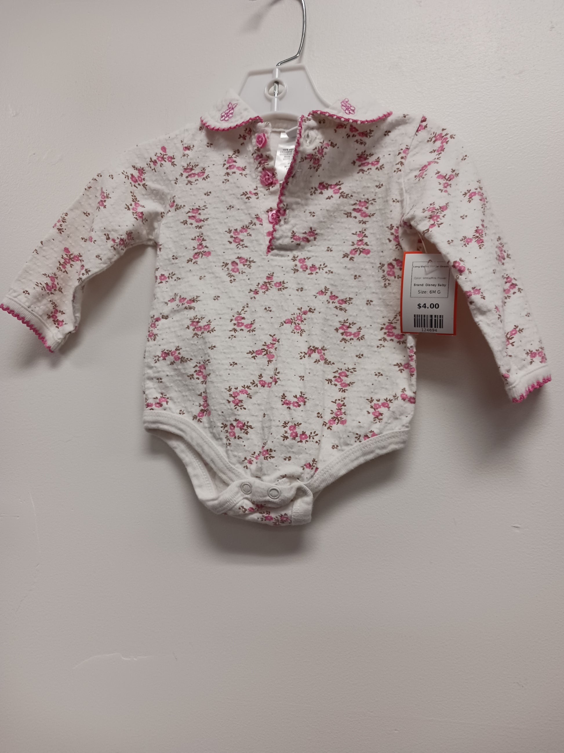 White/Pink Flower Disney Baby Long Sleeve Flower Onesie, 6M G